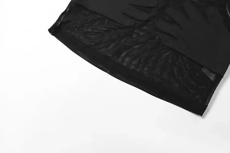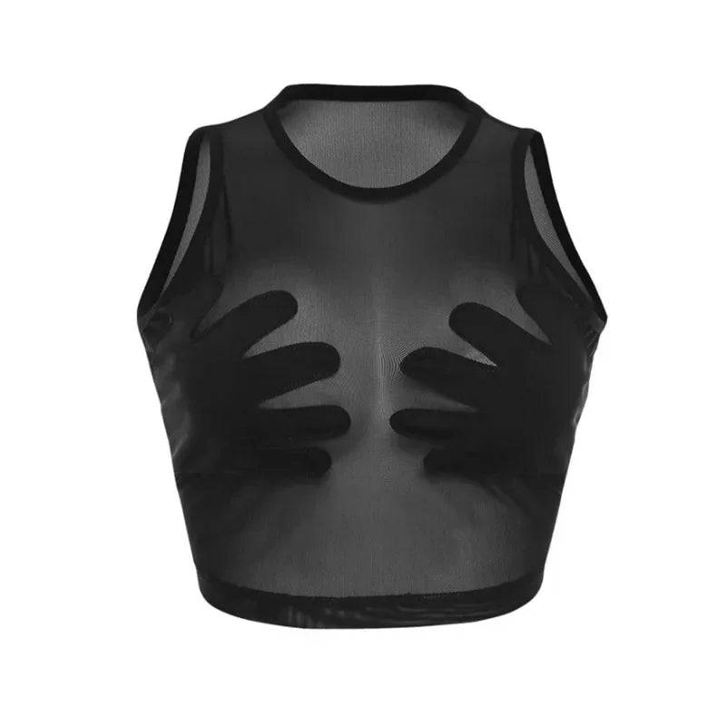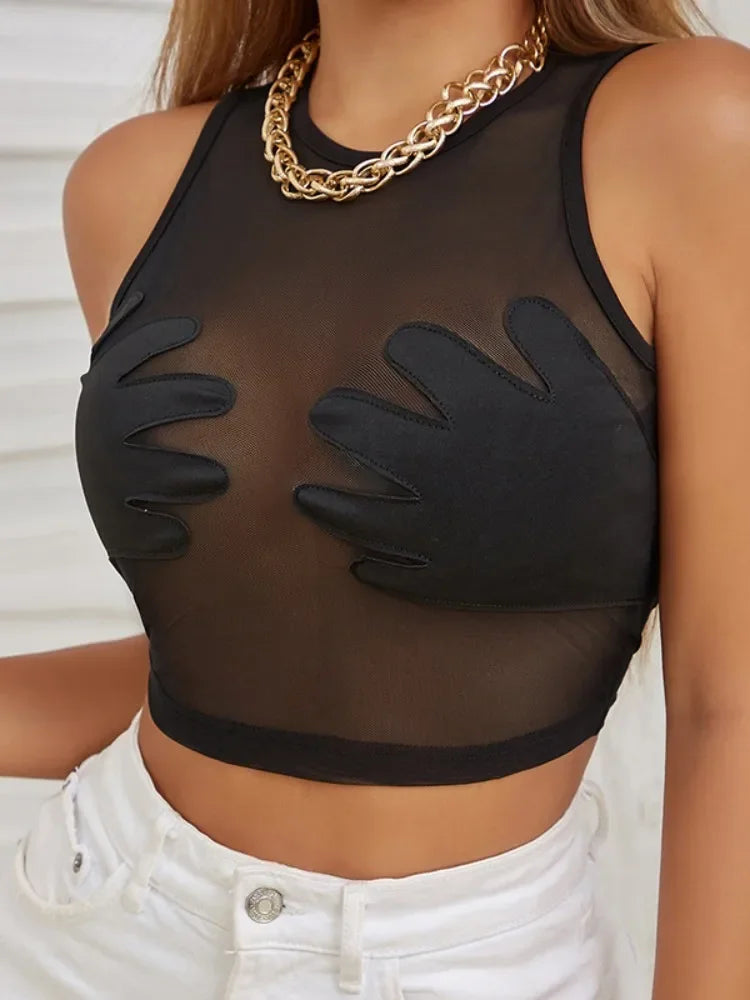 Fashion Round Neck Sleeveless Y2k Top Sexy Net Yarn Slightly Sheer Women Clothing High Stretch Embroidery Streetwear Crop Top
