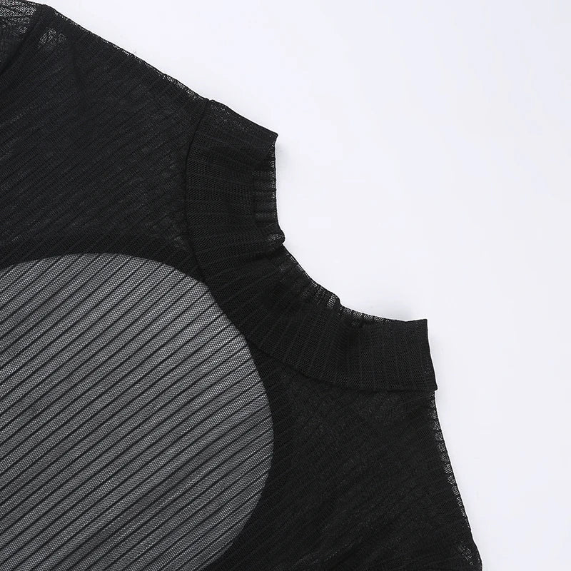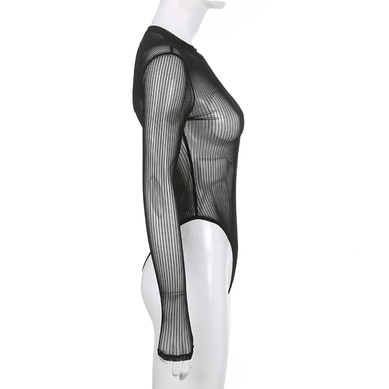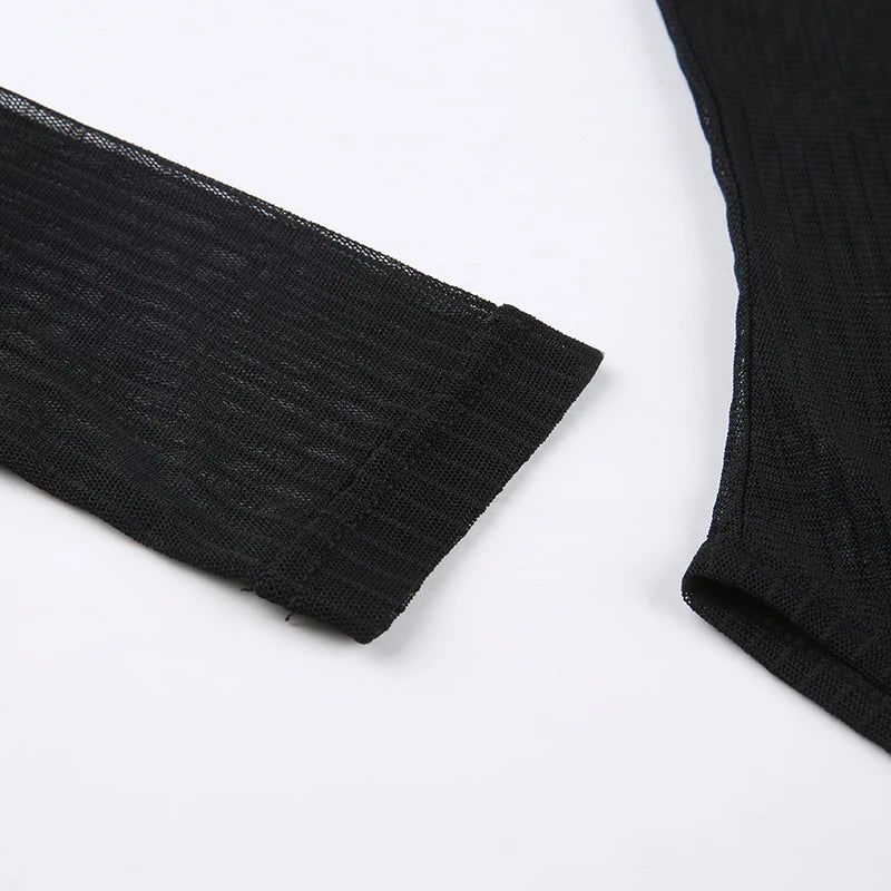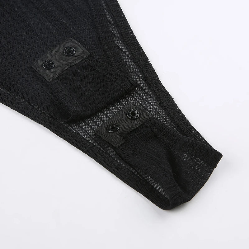 SUCHCUTE Sexy See Though Women T-shirts Gothic Mesh Black Long Sleeve Skinny Bodysuit Dark Fashion Hollow Out Backless Playsuit